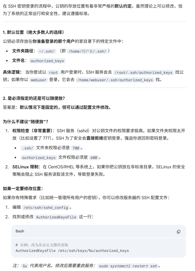 私钥是我们本地保存使用,把公钥上传到服务器,并且设置对应的权限。然后在配置文件中启用密钥登录即可